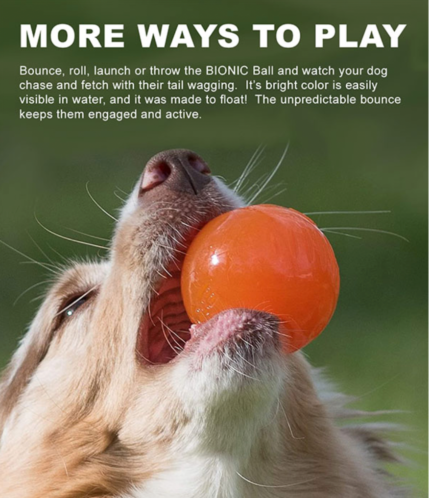MORE WAYS TO PLAY: The BIONIC Ball has great bounce, can float and has a bright BIONIC orange coloring for visibility. It’s great for fetch, and both indoor and outdoor play. The medium size BIONIC Ball is sized to fit most ball launchers and throwers.