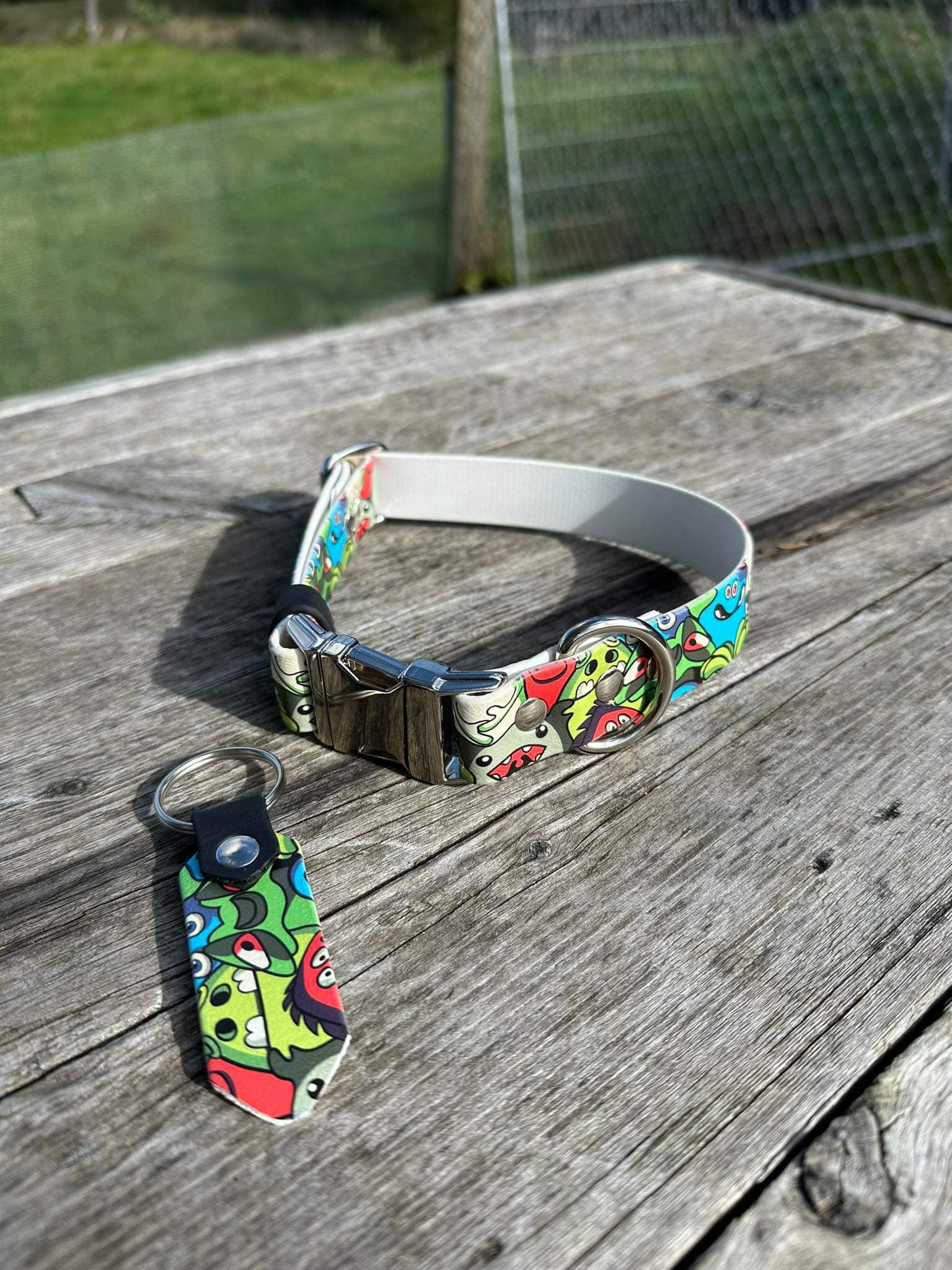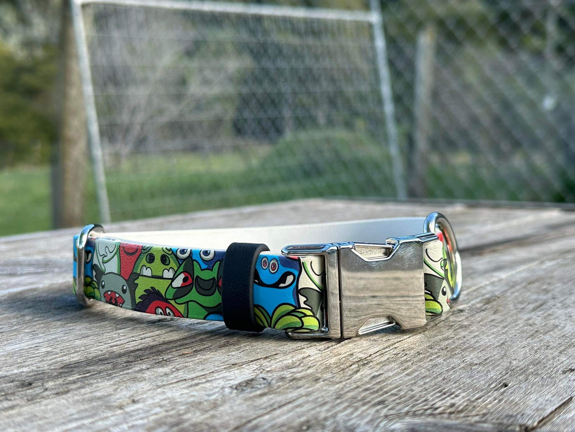 Elevate your style with these beautiful UV printed genuine USA made BioThane collars. Chose from a variety of awesome designs, and match to an accent colour and we will custom make to your colour and size selection (we can also make this on a Martingale lead, get in touch to order).