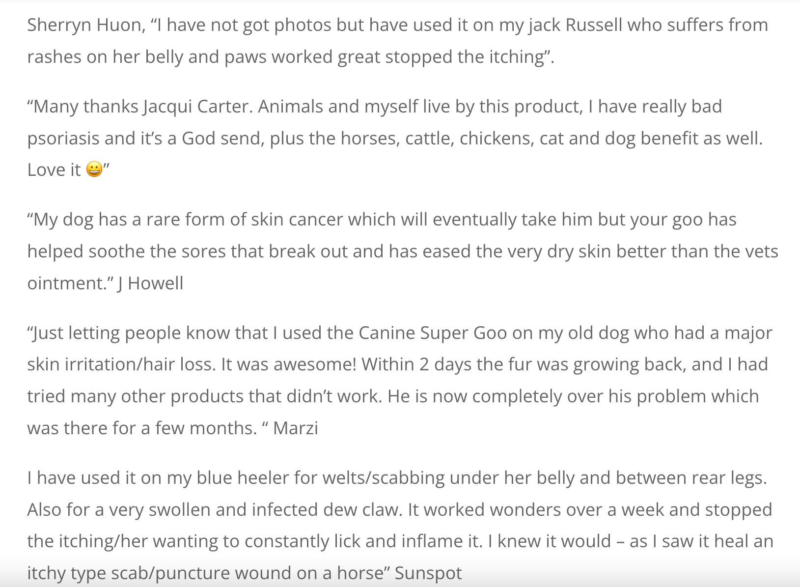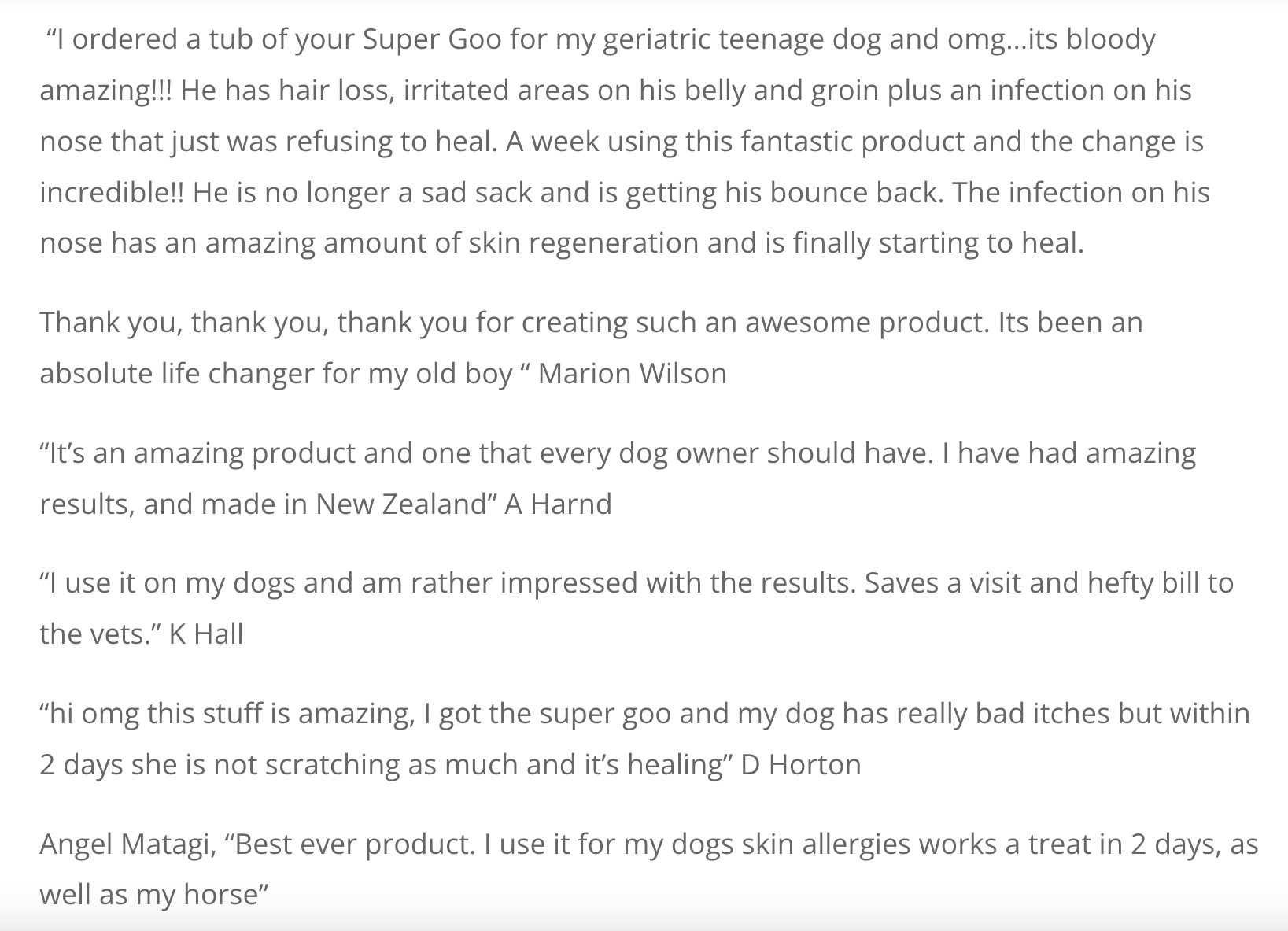 This ultra healing balm is an essential item! Canine Super Goo has unsurpassed anti-fungal and antiseptic properties that has proven to be amazing for treating wounds, promoting hair growth and eases pain for wounds and muscles and stops itchy skin.