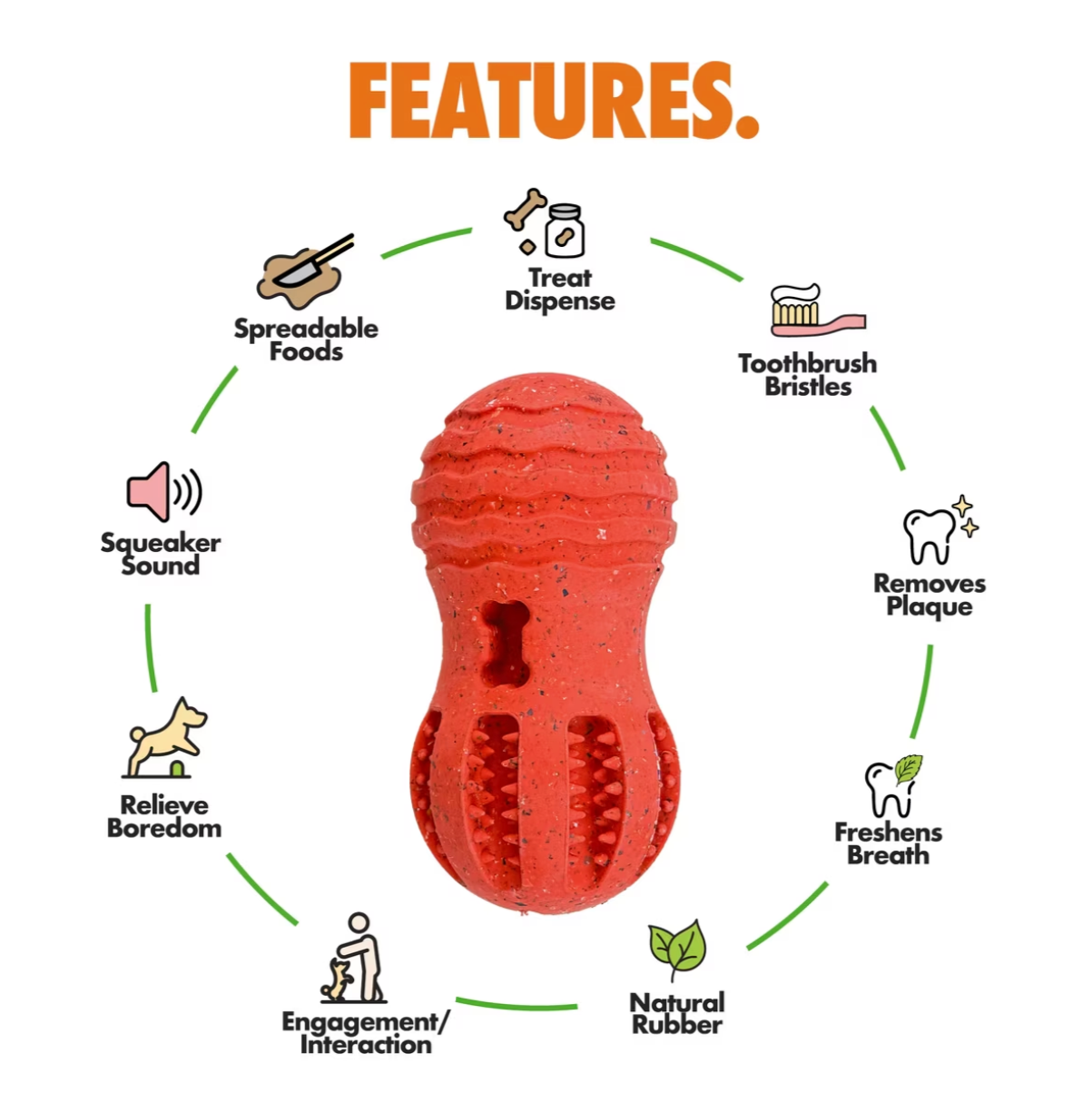Fill the toothbrush-style grooves with dog toothpaste or a favourite treat like peanut butter, and let your dog lick, chew, and squeak their way to a cleaner smile. The built-in squeaker keeps them hooked, while the bristles get to work on plaque and tartar with every bite.